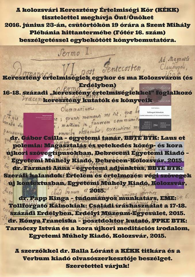 A kolozsvári Keresztény Értelmiségi Kör (KÉKK) Keresztény értelmiségiek egykor és ma Kolozsváron (és Erdélyben) címmel szervez beszélgetéssel egybekötött könyvbemutatót 2016.